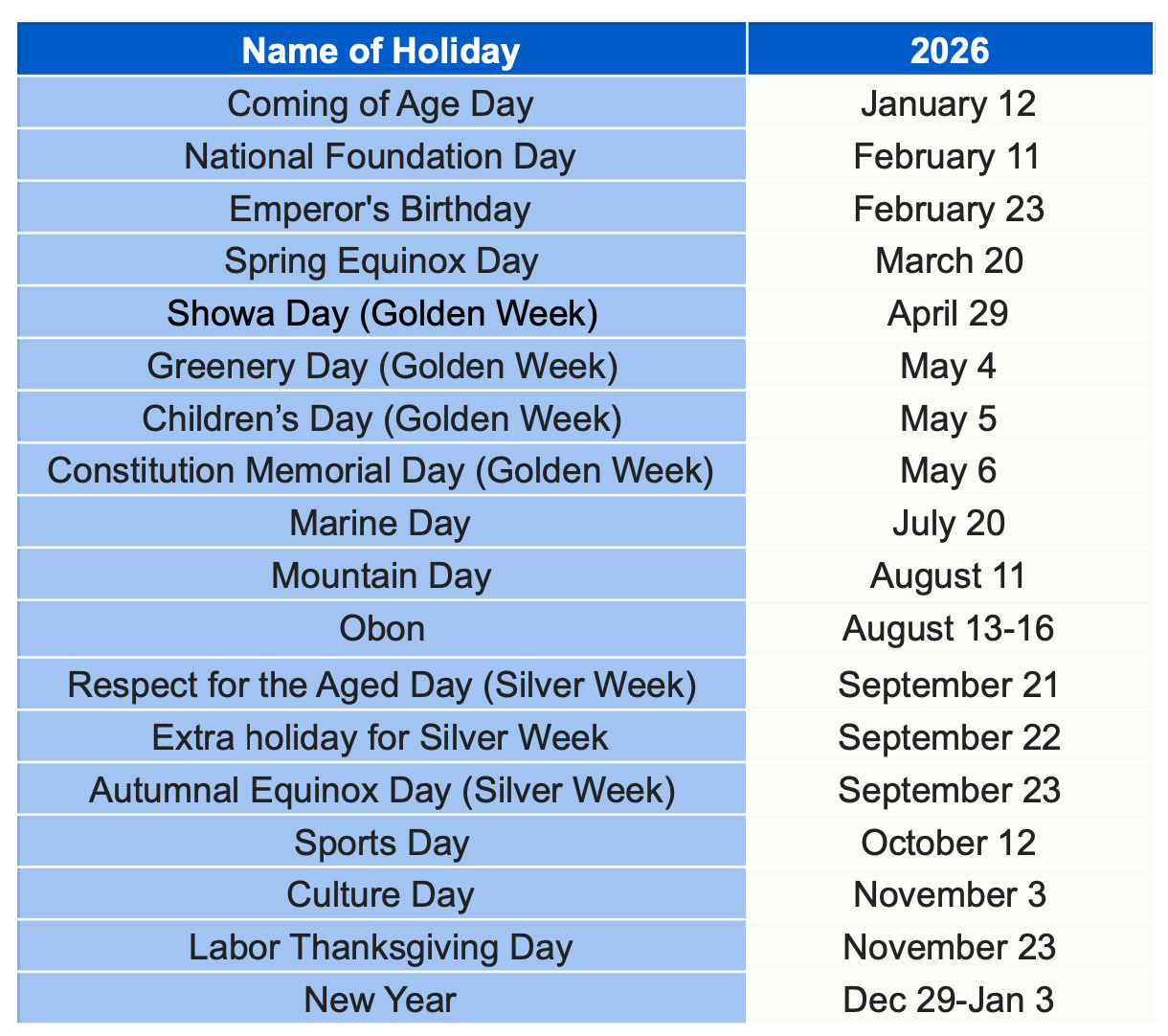 Le tableau suivant présente les jours fériés japonais pour l'année 2026.