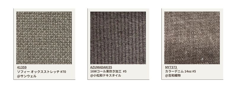 Ce matériau est réputé difficile à fabriquer au Japon car il est utilisé pour le denim léger. Trois variations de couleur sont obtenues grâce à un contrôle précis de la concentration de la teinture.