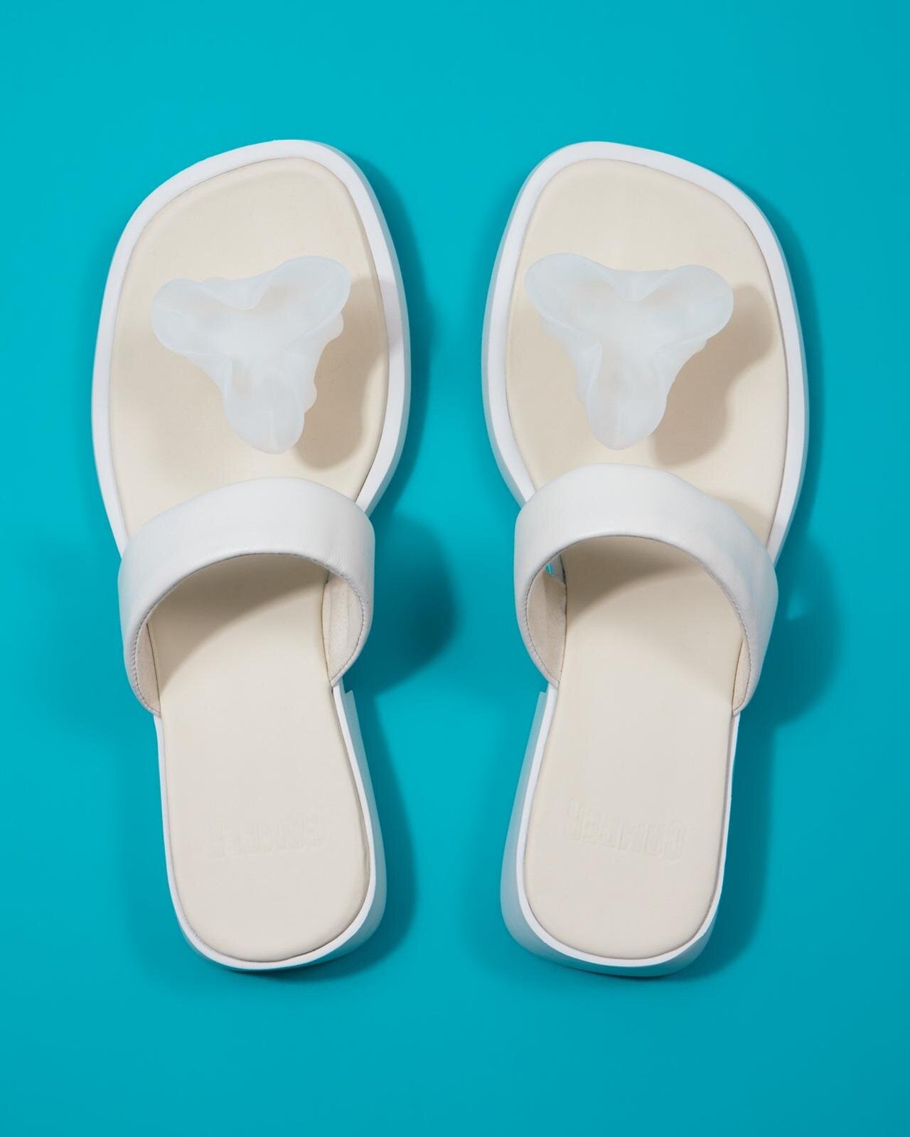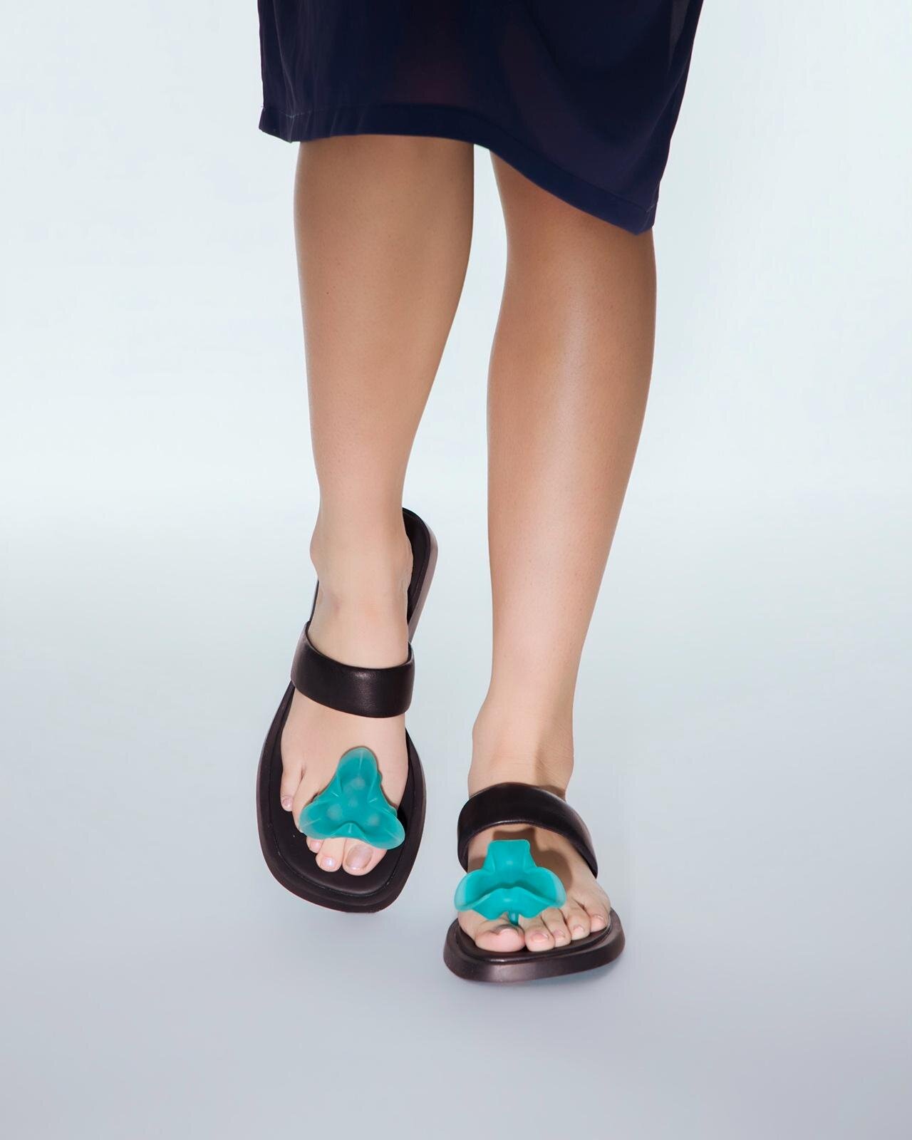 Un sac à main en forme de tulipe et des sandales ornées de motifs floraux sur les brides. L'utilisation d'éléments en relief est une caractéristique unique des sacs et des chaussures.