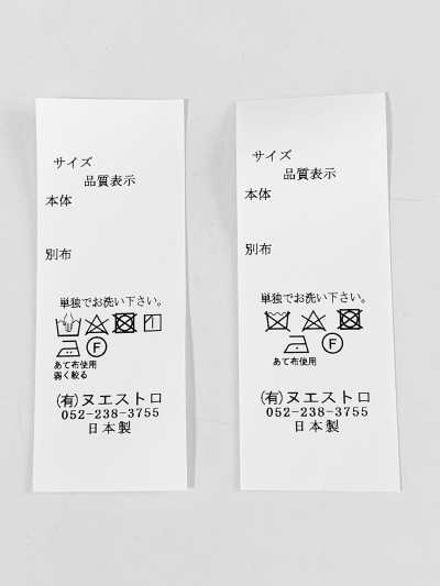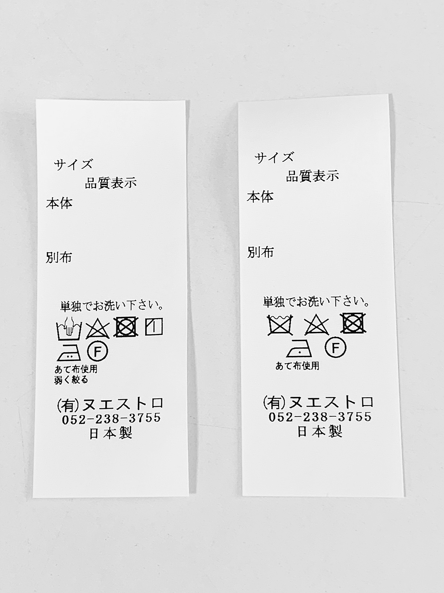 1. Composition des fibres (indiquer le nom de la fibre et le rapport de mélange) 2.Méthode de manipulation pour le lavage à domicile, etc. (Indiquer conformément aux dispositions de 4.1 et 4.3 de JIS L0217 en utilisant des pictogrammes pour la manipulation.) 3. Note complémentaire du nom de la personne qui s'est affichée (Ajouter le "nom ou le nom" et "l'adresse ou le numéro de téléphone" de la personne qui s'est affichée)